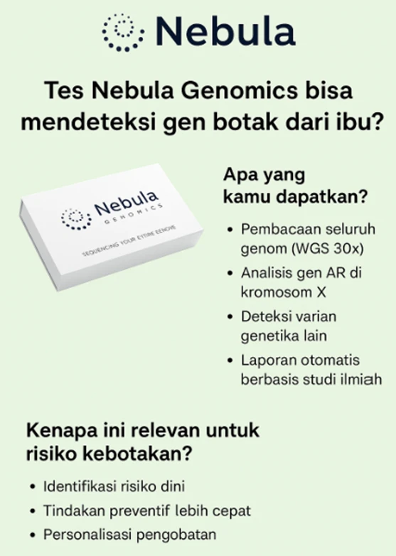 - Identifikasi Risiko Dini: Tes ini bisa menunjukkan apakah kamu mewarisi varian gen AR sensitif dari ibu—faktor besar dalam kebotakan pria.