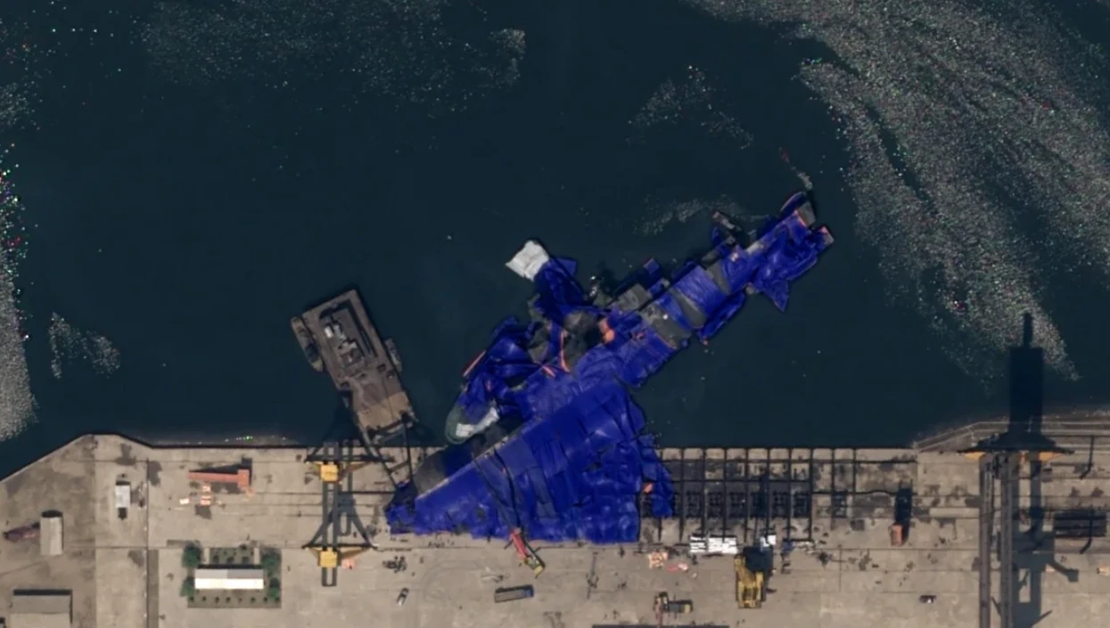 Foto satelit menunjukkan kapal dalam posisi miring: buritan di dalam air, sementara haluan masih di atas galangan. Sal Mercogliano, profesor maritim di Campbell University, menyatakan bahwa kerusakan akibat peluncuran seperti ini bisa berakibat “katastrofik.”