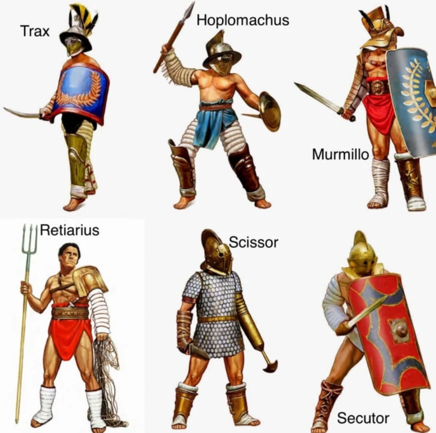 Gladiator bukan hanya petarung biasa, tetapi mereka memiliki spesialisasi berdasarkan perlengkapan dan gaya bertarung.